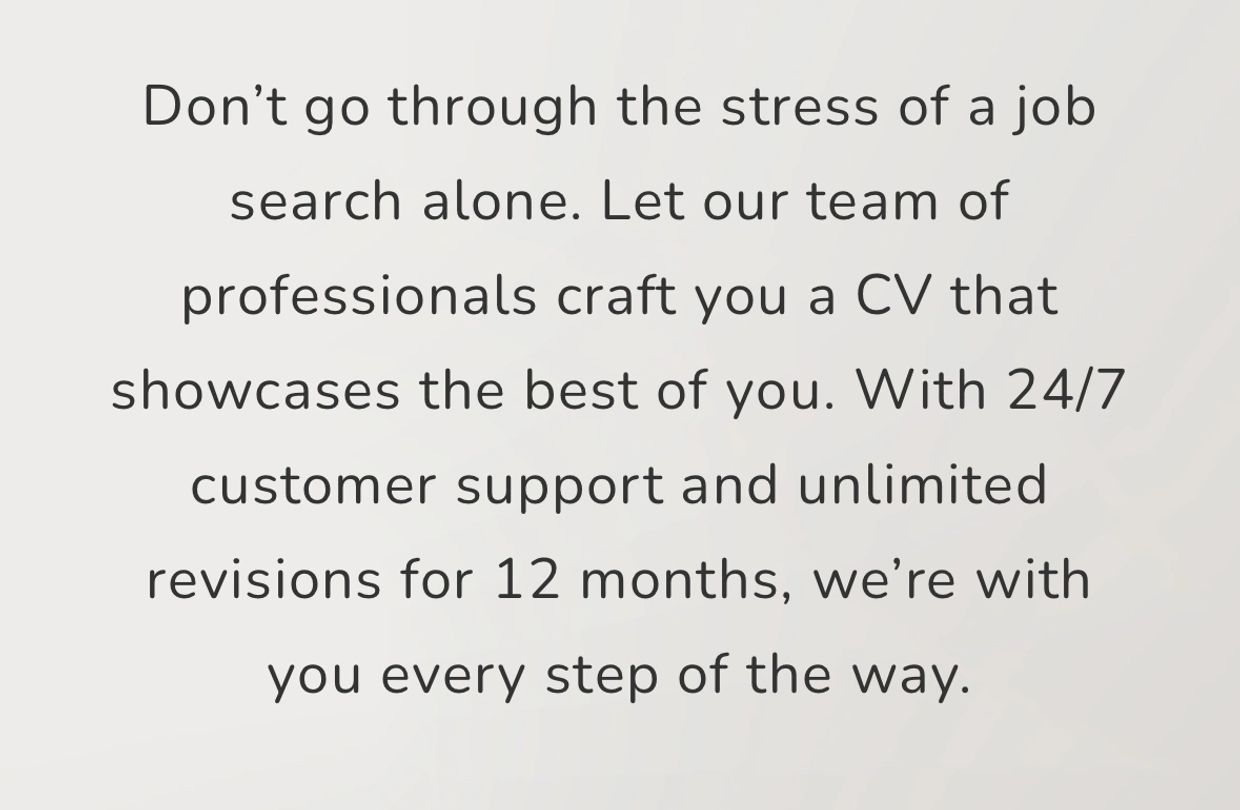 We believe a standout CV shouldn’t come at a high cost. That’s why our pricing is fair and transparent, backed by a 100% satisfaction guarantee.